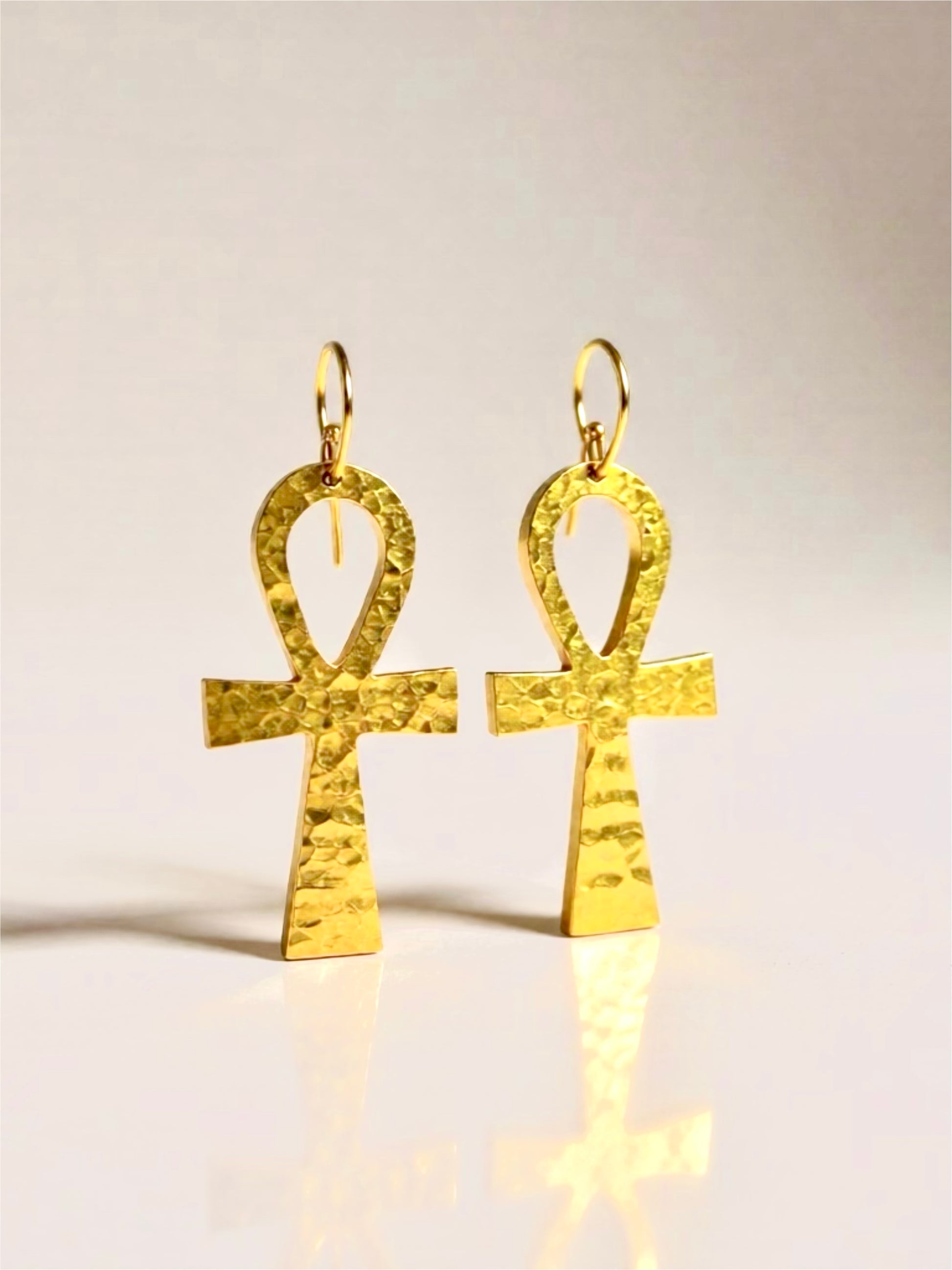 Boucles d’oreilles “Clé de Vie” — Croix Ankh en laiton doré martelé