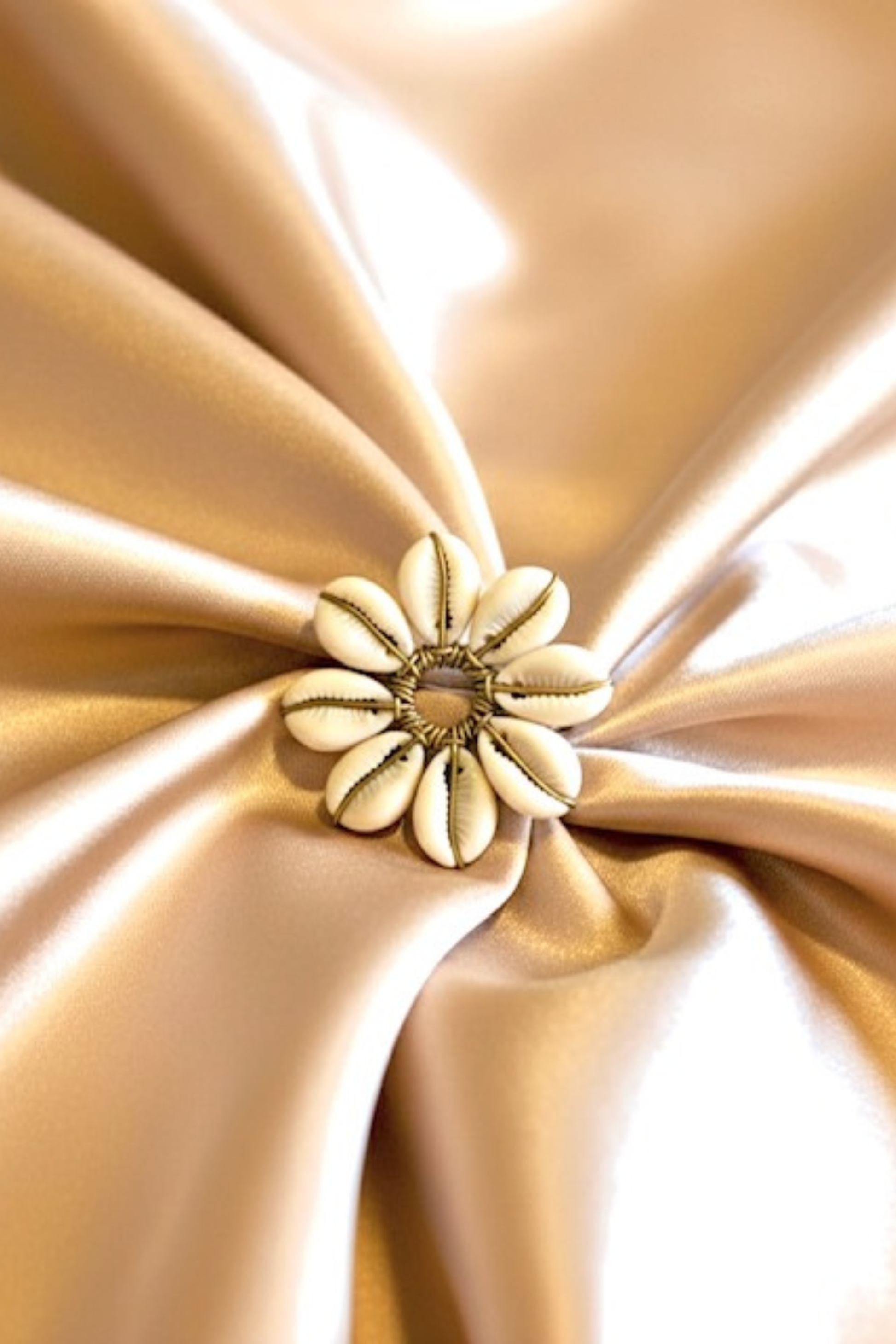 La Fleure de Cauri est une bague dorée artisanale façonnée à la main en laiton et ornée de véritables coquillages cauris assemblés en corolle circulaire.